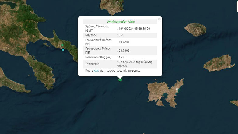Σεισμική δόνηση μεγέθους 3,7 βαθμών της Κλίμακας Ρίχτερ σημειώθηκε το πρωί του Σαββάτου (19/10) στη Λήμνο.