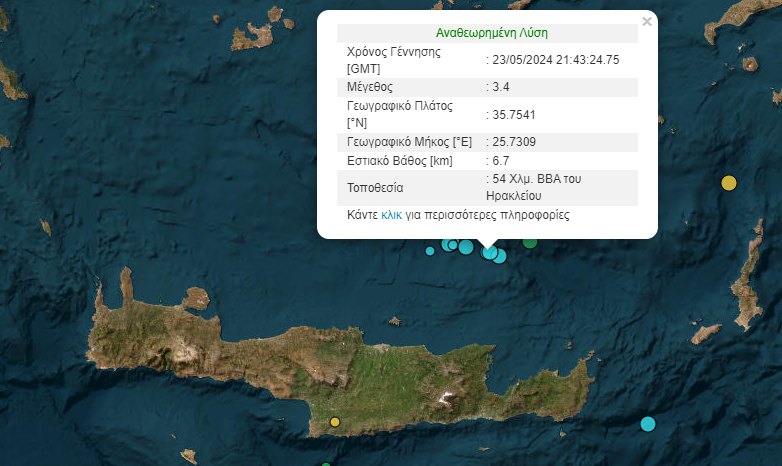 Σεισμική δόνηση μεγέθους 3,8 βαθμών της Κλίμακας Ρίχτερ σημειώθηκε στις 00:26 τα ξημερώματα της Παρασκευής (24/5) στην Κρήτη.
