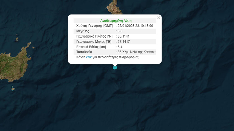 Σεισμική δόνηση μεγέθους 3,8 βαθμών της Κλίμακας Ρίχτερ σημειώθηκε στις 01:10 τα ξημερώματα της Τετάρτης (29/1) στη θαλάσσια περιοχή της Kάσου.