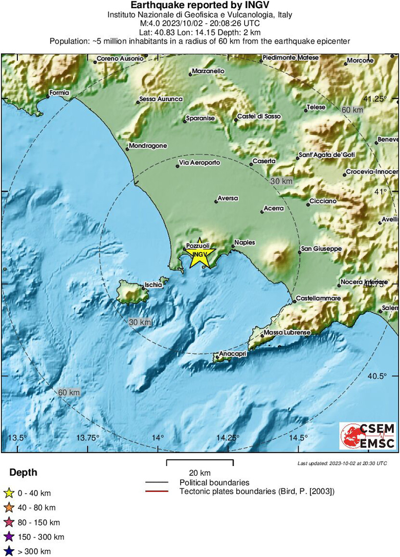 Το εστιακό βάθος, σύμφωνα με το ιταλικό ινστιτούτο γεωφυσικής, ήταν τριών χιλιομέτρων. Ο αποψινός σεισμός έγινε έντονα αισθητός και στη Νάπολη, όπου πολύς κόσμος βγήκε στους δρόμους.