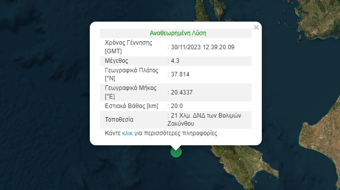 Σεισμική δόνηση μεγέθους 4,3 βαθμών της κλίμακας Ρίχτερ σημειώθηκε το μεσημέρι της  Πέμπτης (30/11), στις 14:39, στη Ζάκυνθο.
