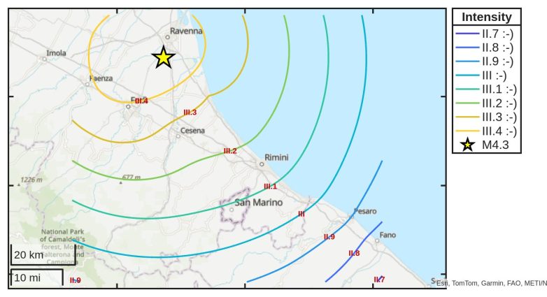 Σύμφωνα με το Ευρωμεσογειακό Ινστιτούτο, το επίκεντρο του σεισμού εντοπίζεται 55 χιλιόμετρα ανατολικά της Μπολόνια και 14 χιλιόμετρα δυτικά της Ραβένα , ενώ το εστιακό βάθος υπολογίζεται στα 20 χιλιόμετρα.