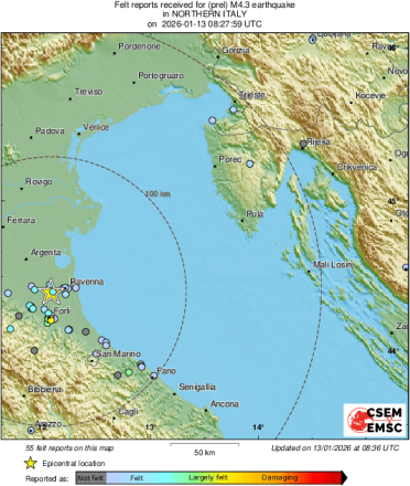 Σεισμική δόνηση μεγέθους 4,4 βαθμών της Κλίμακας Ρίχτερ σημειώθηκε στις 10:28 (ώρα Ελλάδος) το πρωί της Τρίτης (13/01) στην Ιταλία.