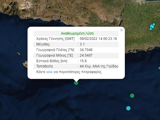 Σεισμική δόνηση μεγέθους 3,1 βαθμών της Κλίμακας Ρίχτερ σημειώθηκε το απόγευμα της Τετάρτης στην Κρήτη.