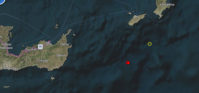 Σεισμική δόνηση 3,4 βαθμών της κλίμακας Ρίχτερ σημειώθηκε στις 11.38 το βράδυ του Σαββάτου σε θαλάσσια περιοχή ανατολικά της Κρήτης και νότια της Καρπάθου, σύμφωνα με την προκαταρκτική μελέτη του Γεωδυναμικού Ινστιτούτου του Εθνικού Αστεροσκοπείου Αθηνών.