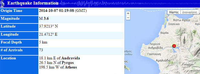 Σεισμική δόνηση μεγέθους 3,6 βαθμών της κλίμακας Ρίχτερ σημειώθηκε στις 4.20 τα ξημερώματα της Τρίτης κοντά στην Ανδραβίδα.