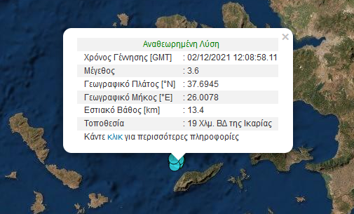 Σεισμική δόνηση μεγέθους 3,6 βαθμών της κλίμακας Ρίχτερ σημειώθηκε στις 14:09 το μεσημέρι της Πέμπτης στην Ικαρία, σύμφωνα με το Γεωδυναμικό Ινστιτούτο του Εθνικού Αστεροσκοπείου Αθηνών.