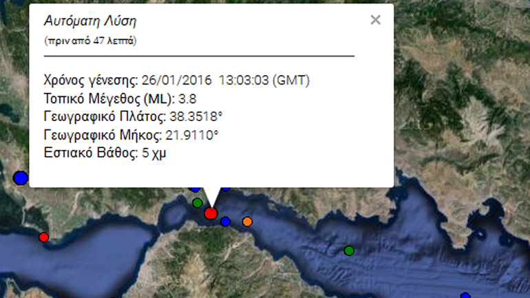 Σύμφωνα με την αυτόματη λύση του Γεωδυναμικού Ινστιτούτο του Εθνικού Αστεροσκοπείου Αθηνών, ο σεισμός είχε μέγεθος βαθμών 3,8 βαθμών της κλίμακας Ρίχτερ και το επίκεντρό του εντοπίστηκε στην θαλάσσια περιοχή του δυτικού Κορινθιακού κόλπου. Το εστιακό βάθος της δόνησης ήταν πέντε χιλιόμετρα.