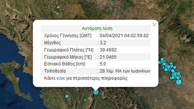 Σεισμική δόνηση μεγέθους 3.2 βαθμών της κλίμακας Ρίχτερ σημειώθηκε 28 χλμ., νοτιοανατολικά των Ιωαννίνων. Το εστιακό βάθος είναι 5 χλμ., σύμφωνα με το Γεωδυναμικό Ινστιτούτο.