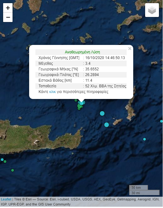 Η δόνηση είχε εστιακό βάθος 11,4 χλμ και επίκεντρο που εντοπίζεται στα 52 χλμ βόρεια-βορειοανατολικά της Σητείας.