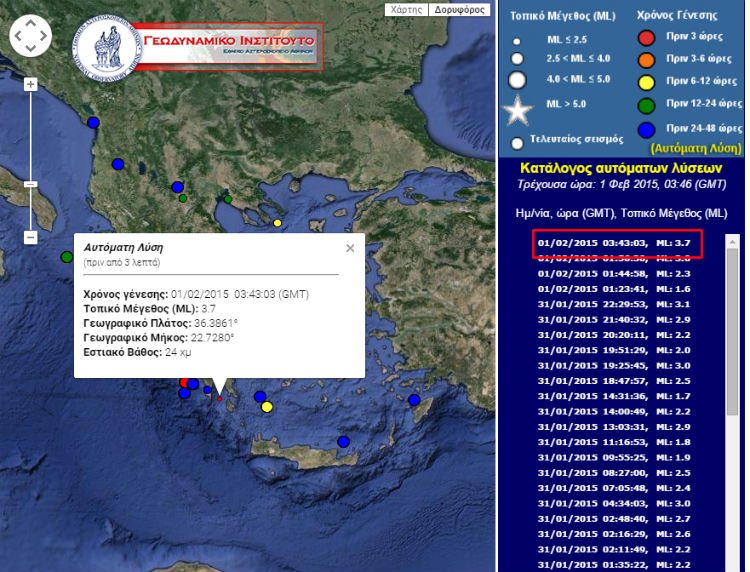 Ασθενής σεισμική δόνηση 3,7R σημειώθηκε στις 5:43 τα ξημερώματα της Κυριακής, στον θαλάσσιο χώρο ανοικτά του Γυθείου στην Πελοπόννησο.