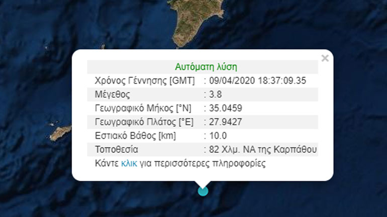 Η δόνηση είχε εστιακό βάθος 10 χλμ και επίκεντρο που εντοπίζεται στα 82 χλμ νοτιοανατολικά της Καρπάθου.