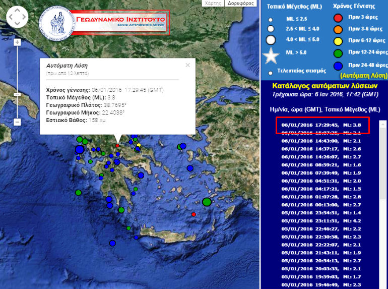 Ασθενής σεισμική δόνηση μεγέθους 3,8 βαθμών της κλίμακας Ρίχτερ σημειώθηκε στις 19:29 το απόγευμα της Τετάρτης, νοτιοδυτικά της Λαμίας.