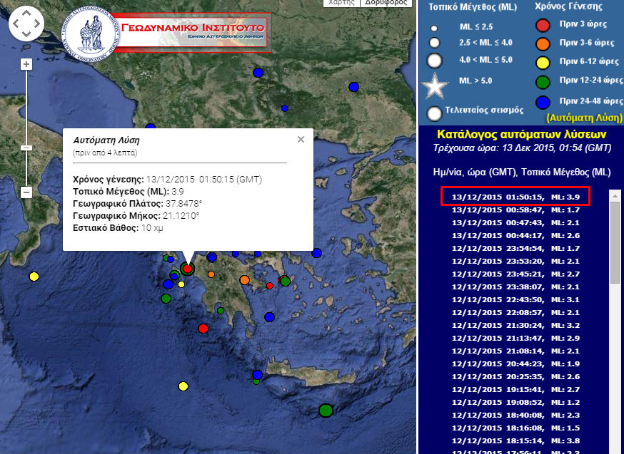 Σεισμική δόνηση μεγέθους 3,9 βαθμών της κλίμακας Ρίχτερ σημειώθηκε στις 3:50 τα ξημερώματα της Κυριακής στην Πελοπόννησο.