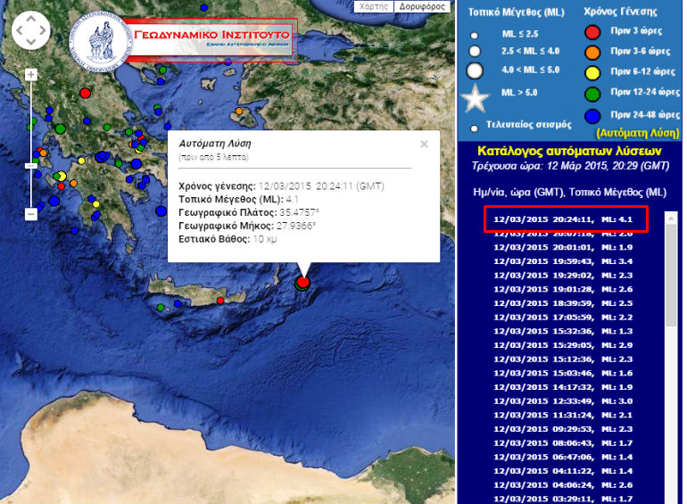 Ασθενής σεισμική δόνηση μεγέθους 4,1 βαθμών της κλίμακας Ρίχτερ σημειώθηκε στις 22:24 το βράδυ της Πέμπτης στη θαλάσσια περιοχή νότια της Ρόδου.
