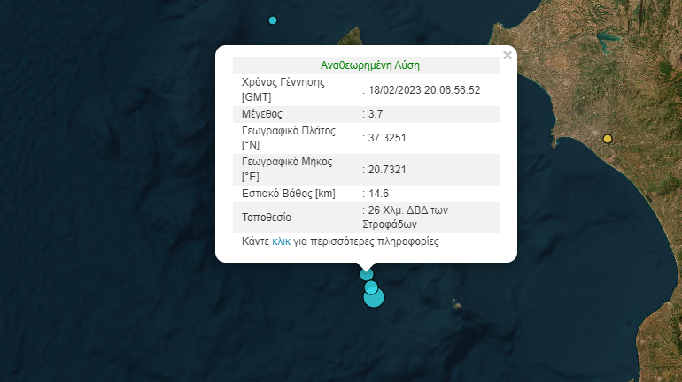 Νωρίτερα στις 22:07 το βράδυ, πραγματοποιήθηκε ένας ακόμη σεισμός στον ίδιο θαλάσσιο χώρο μεγέθους 3,7 βαθμών της Κλίμακας Ρίχτερ. Το επίκεντρο του σεισμού εντοπίζεται 26 χιλιόμετρα βορειοδυτικά ττων Στροφάδων, ενώ το εστιακό βάθος υπολογίζεται στα 14,6 χιλιόμετρα.