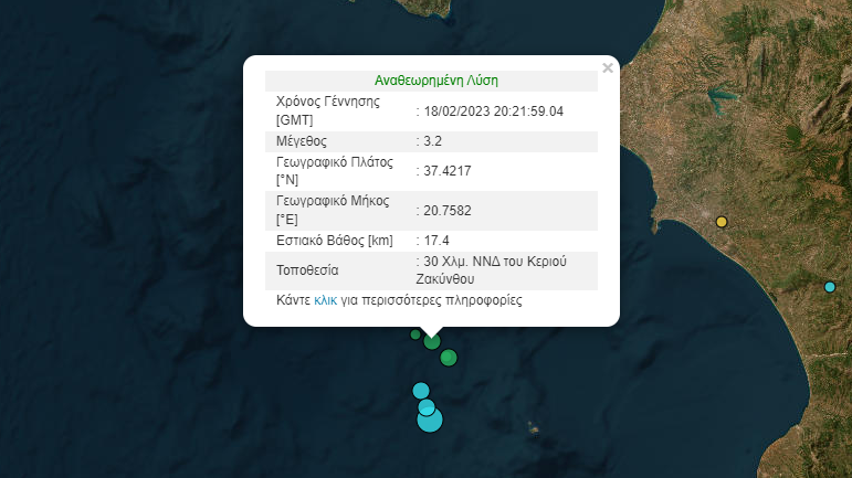Λίγα λεπτά αργότερα στις 22:22 το βράδυ, ακολούθησε νέος σεισμός στην ίδια περιοχή μεγέθους 3,2 βαθμών της Κλίμακας Ρίχτερ. Το επίκεντρο του σεισμού εντοπίζεται 30 χιλιόμετρα νοτιοδυτικά του Κεριού Ζακύνθου, ενώ το εστιακό βάθος υπολογίζεται στα 17,4 χιλιόμετρα.