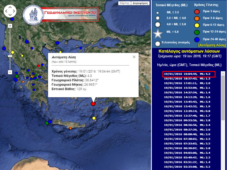 Σεισμική δόνηση μεγέθους 4,3 βαθμών της κλίμακας Ρίχτερ σημειώθηκε στις 21:04 το βράδυ της Τρίτης στο θαλάσσιο χώρο 15 χιλιόμετρα νοτιοανατολικά της νήσου Κέφαλος, στα Δωδεκάνησα.