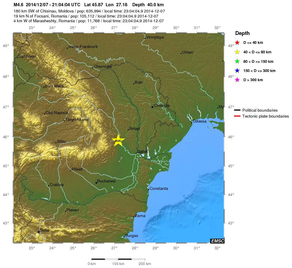 Σεισμική δόνηση μεγέθους 4,6 βαθμών της κλίμακας Ρίχτερ σημειώθηκε λίγο μετά τις 11 το βράδυ της Κυριακής στα βορειοανατολικά της χώρας, κοντά στα σύνορα με την Μολδαβία.