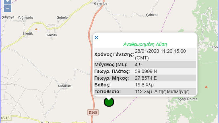 Σεισμική δόνηση μεγέθους 4,9 της κλίμακας Ρίχτερ σημειώθηκε στις 11:26 σε θαλάσσια περιοχή της Μυτιλήνης. Το επίκεντρο εντοπίζεται 112 χλμ. ανατολικά της Μυτιλήνης. Ο σεισμός είχε εστιακό βάθος 15,6 χλμ.