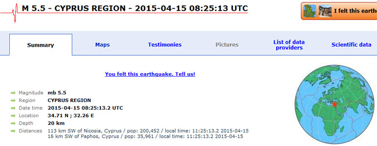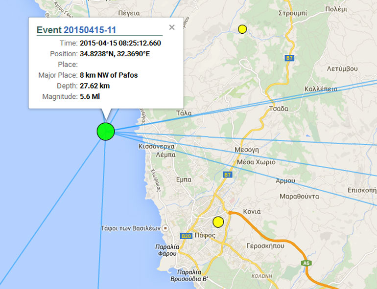 Νωρίτερα το Ευρωπαϊκό Μεσογειακό Σεισμολογικό Ινστιτούτο ανακοίνωσε οτι πρόκεται για δόνηση μεγέθους 5,5 βαθμών της κλίμακας Ρίχτερ με επίκεντρο 16 χιλιόμετρα νοτιοδυτικά της Πάφου (113 χιλιόμετρα νοτιοδυτικά της Λευκωσίας) και με εστιακό βάθος στα 20 χιλιόμετρα.