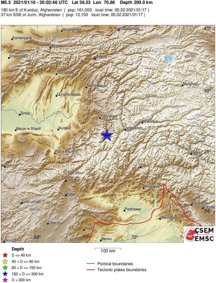 Σεισμική δόνηση μεγέθους 5,5 βαθμών της κλίμακας Ρίχτερ σημειώθηκε στις λίγο μετά τις 22:00 (ώρα Ελλάδας) στο Αφγανιστάν, σύμφωνα με το Ευρωπαϊκό Μεσογειακό Σεισμολογικό Κέντρο (EMSC).