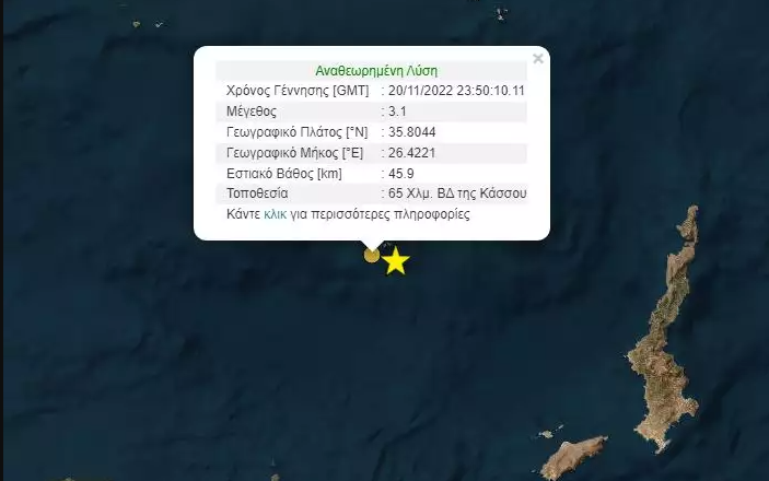 Ειδικότερα, σύμφωνα με το Γεωδυναμικό Ινστιτούτο, ο μετασεισμός καταγράφηκε στα 65 χιλιόμετρα βορειοδυτικά της Κάσσου, σε εστιακό βάθος 45,9 χιλιόμετρα.