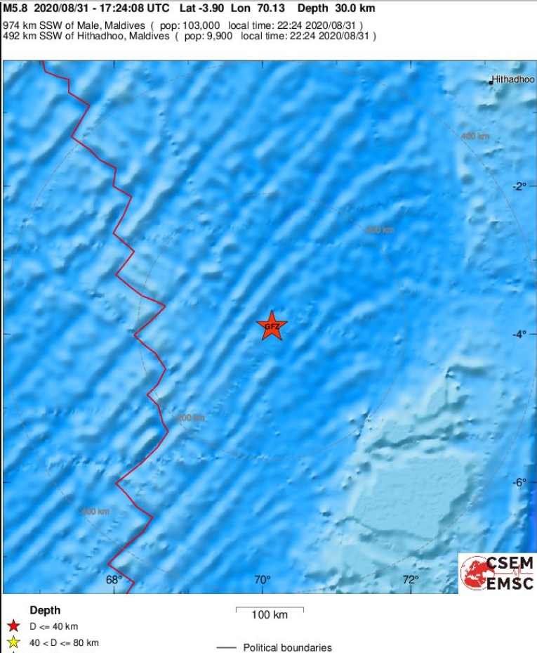 Σεισμική δόνηση μεγέθους 6,2 βαθμών της κλίμακας Ρίχτερ σημειώθηκε στις 20:24 το βράδυ της Δευτέρας στα νησιά Τσάγκος και συγκεκριμένα 974 χλμ. νοτιοδυτικά από το Μάλε, την πρωτεύουσα των Μαλδίβων.