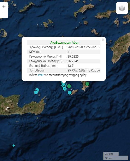 Η ακριβής τοποθεσία είναι στη θαλάσσια περιοχή 25 χλμ. Δυτικά – Βορειοδυτικά της Κάσου και το εστιακό βάθος είναι 13,7 χλμ. Σχεδόν μισή ώρα αργότερα, σημειώθηκε μετασεισμός μεγέθους 3,2 Ρίχτερ σε κοντινή απόσταση.