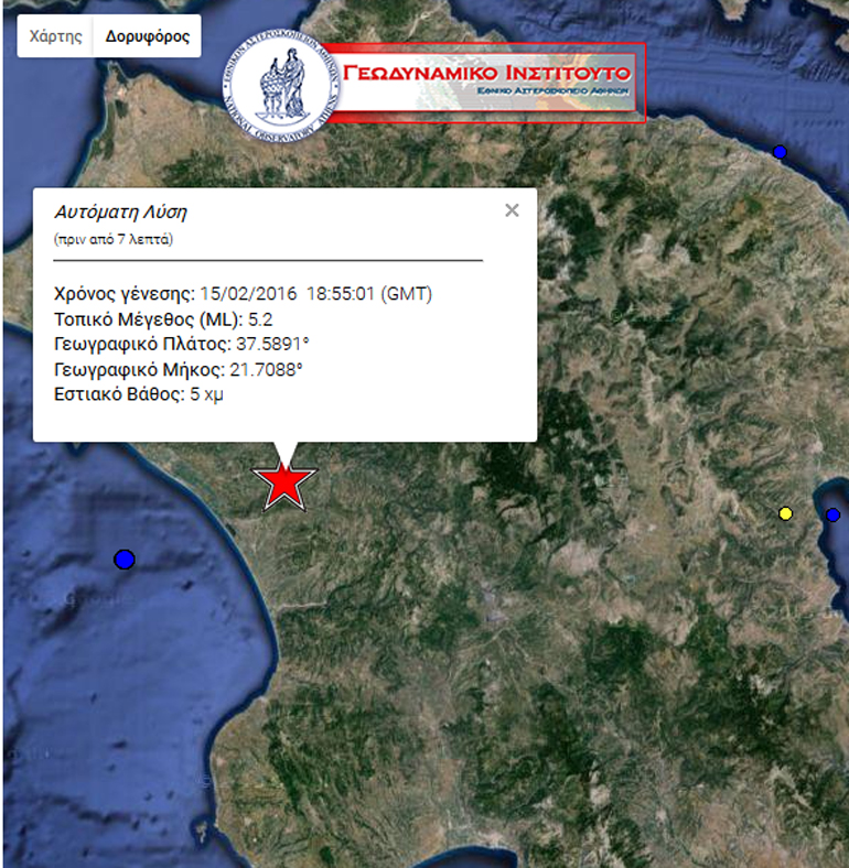 Ισχυρή σεισμική δόνηση 5,2 βαθμών της κλίμακας Ρίχτερ σημειώθηκε στις 20.55 το βράδυ της Δευτέρας στον Νομό Ηλείας.