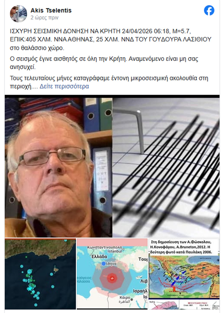 Σε ανάρτησή του, ο σεισμολόγος Άκης Τσελέντης εμφανίζεται καθησυχαστικός, επισημαίνοντας ότι η σεισμική δραστηριότητα στην περιοχή ήταν αναμενόμενη, καθώς τους τελευταίους μήνες καταγραφόταν αυξημένη μικροσεισμική ακολουθία.