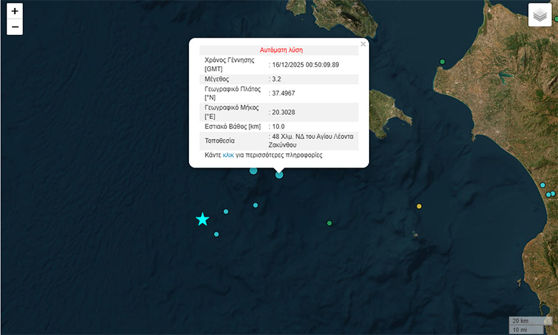 Ισχυρή σεισμική δόνηση μεγέθους 5,2 βαθμών της κλίμακας Ρίχτερ, σημειώθηκε πριν από λίγο στον θαλάσσιο χώρο νοτιοδυτικά του Αγίου Λέοντα Ζακύνθου και σε απόσταση 89 χιλιομέτρων δυτικά, νοτιοδυτικά του νησιού.