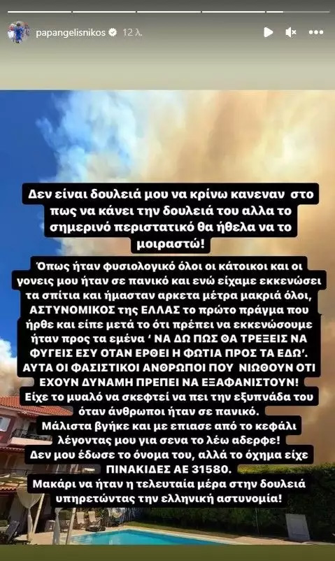 Όπως ήταν φυσιολογικό, όλοι οι κάτοικοι και οι γονείς μου ήταν σε πανικό και ενώ είχαμε εκκενώσει τα σπίτια και ήμασταν αρκετά μέτρα μακριά όλοι, ΑΣΤΥΝΟΜΙΚΟΣ της ΕΛΑΣ το πρώτο πράγμα που ήρθε και είπε μετά το ότι πρέπει να εκκενώσουμε ήταν προς τα εμένα “ΝΑ ΔΩ ΠΩΣ ΘΑ ΤΡΕΞΕΙΣ ΝΑ ΦΥΓΕΙΣ ΕΣΥ ΟΤΑΝ ΕΡΘΕΙ Η ΦΩΤΙΑ ΠΡΟΣ ΤΑ ΕΔΩ”. ΑΥΤΟΙ ΟΙ ΦΑΣΙΣΤΙΚΟΙ ΑΝΘΡΩΠΟΙ ΠΟΥ ΝΙΩΘΟΥΝ ΟΤΙ ΕΧΟΥΝ ΔΥΝΑΜΗ ΠΡΕΠΕΙ ΝΑ ΕΞΑΦΑΝΙΣΤΟΥΣΝ!
