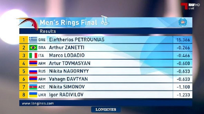 Τα περισσότερα έχουν κατακτήσει ο Λευτέρης Πετρούνιας με 3 χρυσά στους κρίκους και ο Βλάσης Μάρας με 2 χρυσά κι ένα χάλκινο στο μονόζυγο.