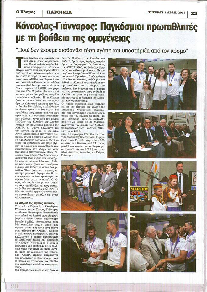 Η ελληνική ομογένεια του Σίδνεϊ κέρδισε το δικό της χρυσό μετάλλιο στη φιλοξενία των δυο πρωταθλητών της Κωπηλασίας κατά την συμμετοχή τους στο Παγκόσμιο Κύπελλο. Οι δυο κωπηλάτες, αλλά και η Κωπηλατική Ομοσπονδία εκφράζουν για μια ακόμη φορά την ευγνωμοσύνη τους προς τους ανθρώπους της ΑΧΕΠΑ.