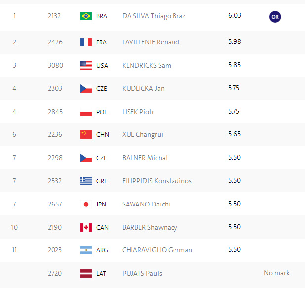 Το χρυσό μετάλλιο κατέκτησε ο Βραζιλιάνος Ντα Σίλβα με 6.03 και άφησε δεύτερο τον μεγάλο Γάλλο Ρενό Λαβιλενί 5.98. Στο βάθρο ανέβηκε και ο Κέντρικς από τις ΗΠΑ με 5.85.