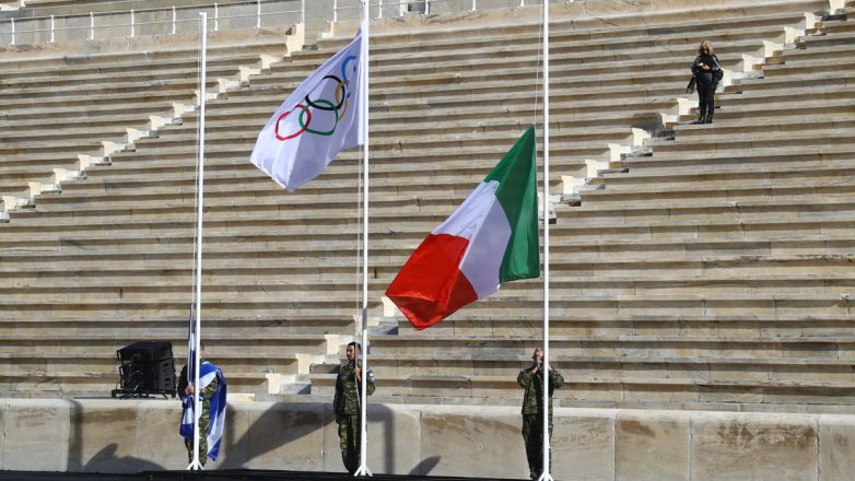 «Η σημερινή ημέρα σηματοδοτεί μια μαγική στιγμή για όλους μας», δήλωσε ο Τζιοβάνι Μαλαγκό, πρόεδρος της οργανωτικής επιτροπής Μιλάνο-Κορτίνα, στο Παναθηναϊκό Στάδιο, όπου αναβίωσαν οι πρώτοι σύγχρονοι Ολυμπιακοί Αγώνες το 1896. Κάτω από τον συννεφιασμένο αθηναϊκό ουρανό και λόγω δυσμενών καιρικών προβλέψεων, οι διοργανωτές αναγκάσθηκαν να συντομεύσουν την τελετή και να ακυρώσουν την προγραμματισμένη συμμετοχή χιλιάδων μαθητών στο Καλλιμάρμαρο Στάδιο.