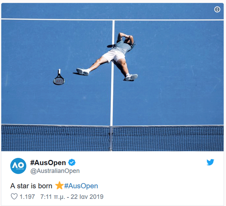 «Ένα αστέρι γεννιέται»: αυτός είναι ο σχολιασμός του επίσημου λογαριασμού του Australian Open στο Twitter, αμέσως μετά τη μεγάλη νίκη του Στέφανου Τσιτσιπά επί του Ισπανού Ρομπέρτο Μπαουτίστα Αγκούτ, με 3-1 σετ (7-5,4-6,6-4,7-6).