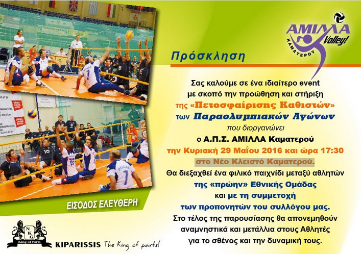 Ο ΑΠΣ ΑΜΙΛΛΑ ΚΑΜΑΤΕΡΟΥ διοργανώνει αγώνα επίδειξης sitting volley την Κυριακή 29 Μαίου 2016 και ώρα 17.30 στο Νέο Κλειστό Γυμναστήριο Καματερού.
