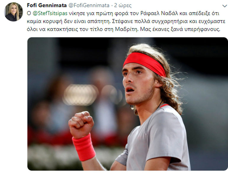 «Ο Στέφανος Τσιτσιπάς νίκησε για πρώτη φορά τον Ράφαελ Ναδάλ και απέδειξε ότι καμία κορυφή δεν είναι απάτητη» αναφέρει σε ανάρτησή της στο Twitter η πρόεδρος του Κινήματος Αλλαγής Φώφη Γεννηματά.