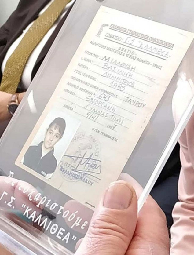 Ο πρόεδρος του συλλόγου, Σπύρος Ερμίδης, παρέδωσε στην εμφανώς συγκινημένη Βασιλική Μιλλούση μια τιμητική πλακέτα, η οποία απεικονίζει το πρώτο δελτίο της ως αθλήτρια, το οποίο εκδόθηκε από την Ομοσπονδία το 1997.