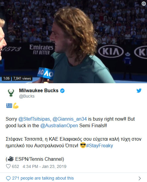 Ο Στέφανος Τσιτσιπάς αναφέρθηκε στον Γιάννη Αντετοκούνμπο (ευχόμενος να ήταν παρών στο αυστραλιανό Όπεν) και οι Μπακς δεν άφησαν την ευκαιρία να πάει χαμένη.