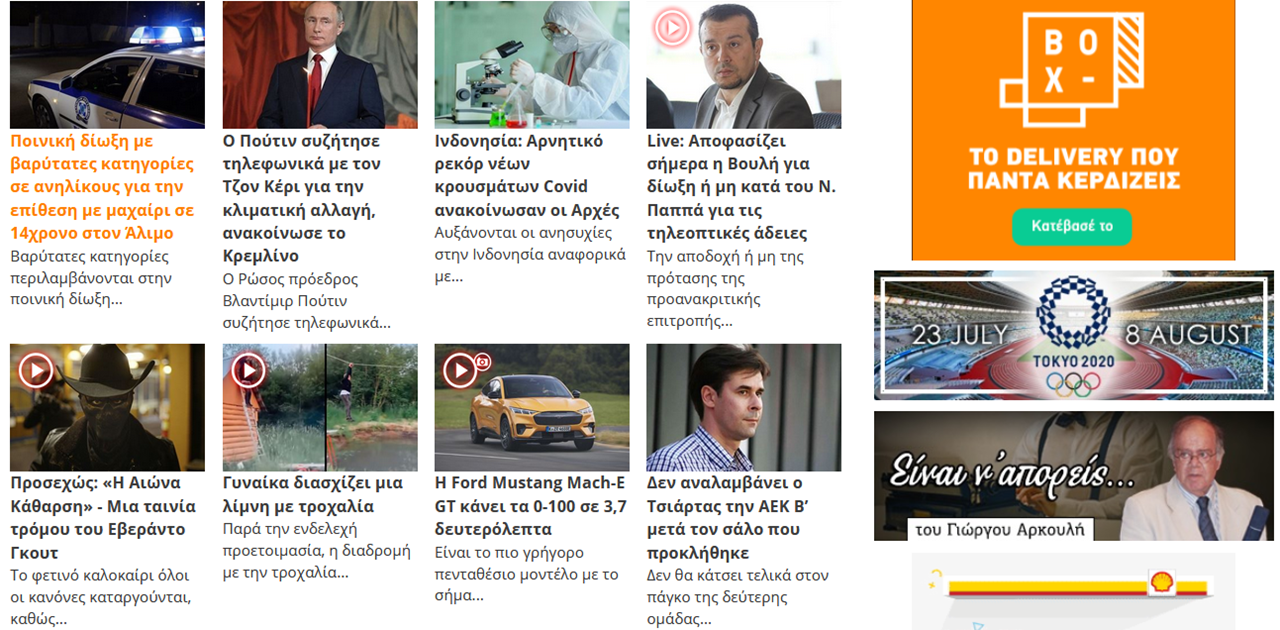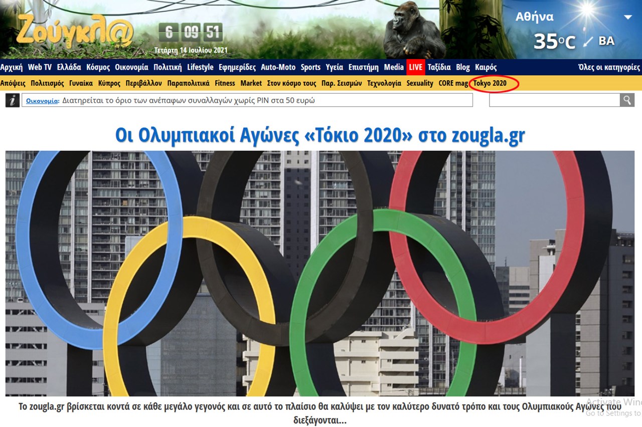 Στο δεξί άκρο της πρώτης σελίδας υπάρχει σχετικό banner στα χρώματα και τα σήματα των Αγώνων, το οποίο οδηγεί στην ειδική ενότητα «Tokyo 2020», όπου συγκεντρώνονται όλες οι ειδήσεις για τη διοργάνωση.