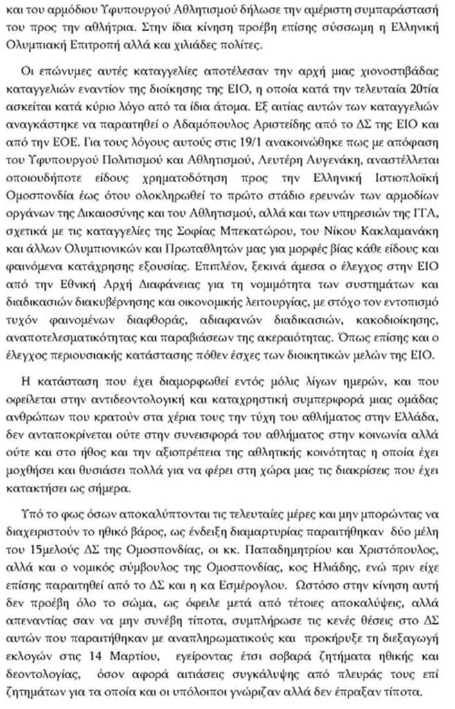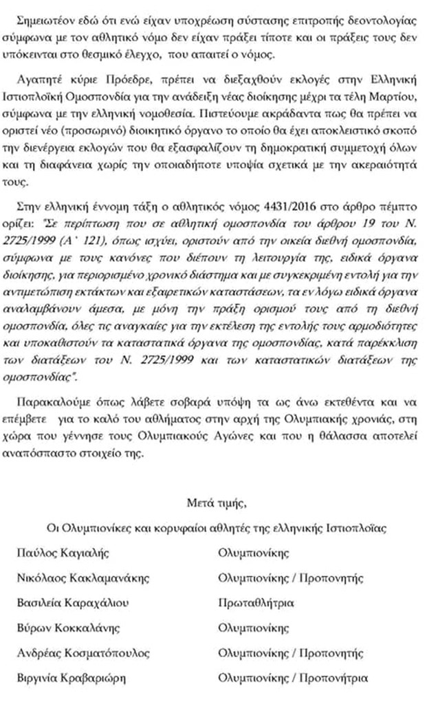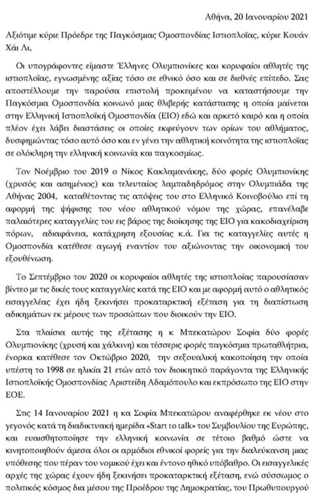 Μέσω της επιστολής γίνεται αναλυτική ενημέρωση για την υπόθεση της Σοφίας Μπεκατώρου και τις καταγγελίες του Νίκου Κακλαμανάκη. Παράλληλα οι Έλληνες Ολυμπιονίκες ζητούν να οριστεί προσωρινό διοικητικό όργανο που θα οδηγήσει σε εκλογές την ΕΙΟ στις 14 Μαρτίου.