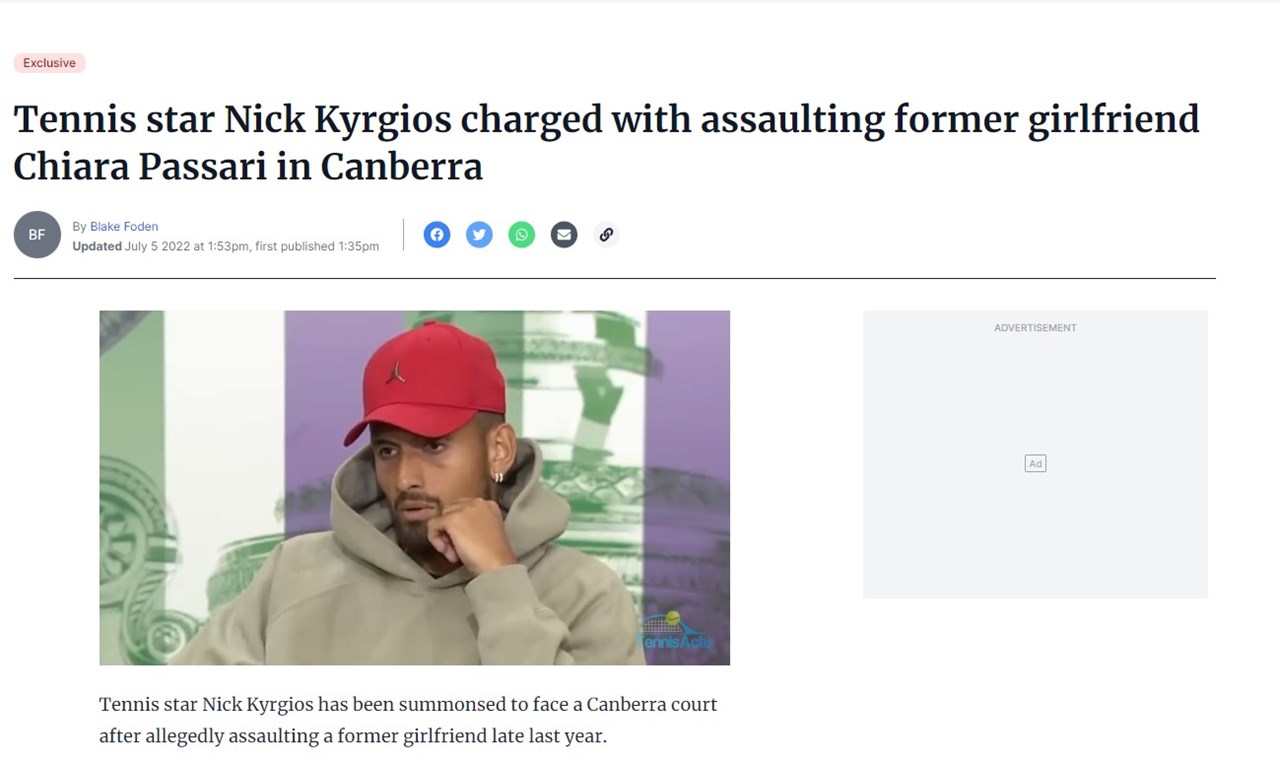 Σύμφωνα με δημοσίευμα της εφημερίδας Canberra Times, ο 27χρονος Αυστραλός τενίστας κατηγορείται για επίθεση στην πρώην σύντροφό του Κιάρα Πάσσαρη τον περασμένο Δεκέμβριο και καλείται να παραστεί στο δικαστήριο στις 2 Αυγούστου.