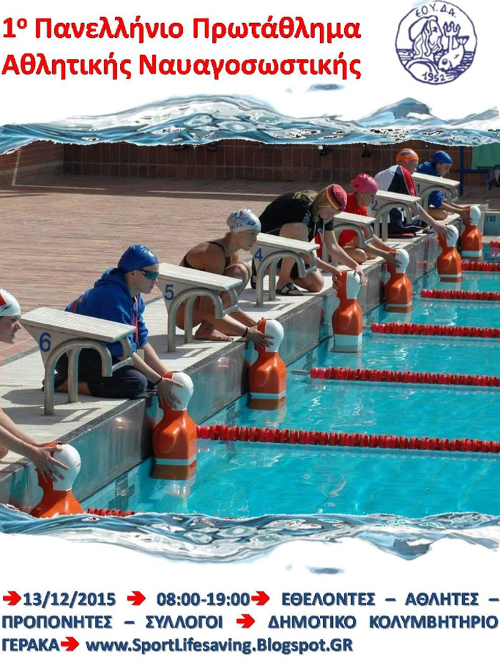 Το πρώτο επίσημο Πανελλήνιο Πρωτάθλημα Αθλητικής Ναυαγοσωστικής θα πραγματοποιήσει η Ελληνική Ομοσπονδία Υποβρύχιας Δραστηριότητας και Αθλητικής Αλιείας (Ε.Ο.Υ.Δ.Α.) στις 13/12/2015 στο Γέρακα, για την προστασία της Δημόσιας Υγείας από πνιγμούς με την αρωγή/στήριξη από τη Γενική Γραμματεία Δημόσιας Υγείας του Υπουργείου Υγείας, το ΚΕ.ΕΛ.Π.ΝΟ., το Safe Water Sports, την Πανελλήνια Ένωση Πτυχιούχων Λειτουργών Φυσικής Αγωγής, το Σύλλογο Ελλήνων Εξαιρετικά Διακριθέντων Αθλητών και τα Διεθνή Βραβεία Giuseppe Sciacca.