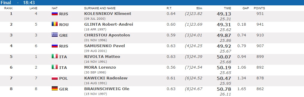Νικητής του αγωνίσματος αναδείχθηκε το μεγάλο φαβορί, ο Ρώσος Κλιμέντ Κολεσνίκοφ (49.13), ο οποίος χρειάστηκε πάντως να δώσει μάχη με τον Ρουμάνο πρωταθλητή Ευρώπης στην 50άρα, Ρόμπερτ-Αντρέι Γκλίντα (49.31), για να διατηρήσει για τρίτη σερί διοργάνωση τον τίτλο.
