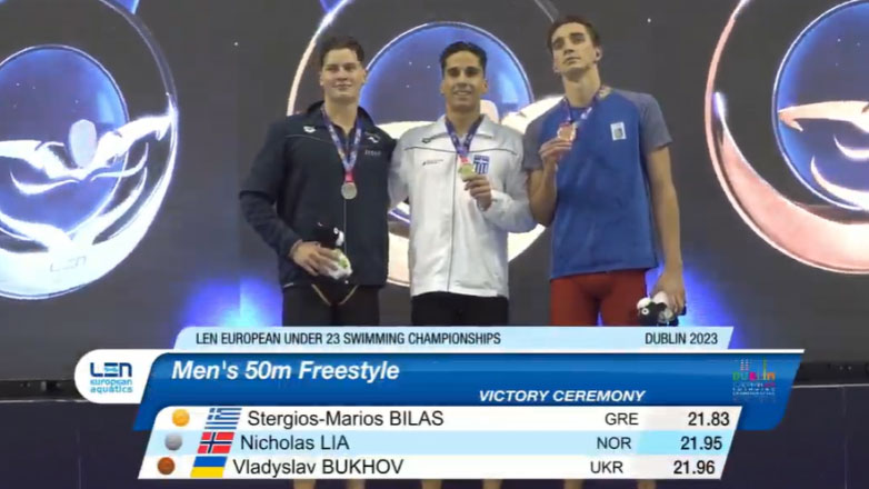 Το δεύτερο χρυσό μετάλλιο χάρισε στην Ελλάδα ο Μάριος Στέργιος Μπίλας, μετά από αυτό του Δημήτρη Μάρκου χθες (11/8) στα 200μ. ελεύθερο. Ο Μάριος Στέργιος Μπίλας έκανε μια καταπληκτική κούρσα στον τελικό στα 50μ. ελεύθερο στο Ευρωπαϊκό πρωτάθλημα κολύμβησης Νέων Ανδρών/Νέων Γυναικών (U23) που λαμβάνει χώρα στο Δουβλίνο. Τερμάτισε πρώτος με χρόνο 21.83 και ανέβηκε στο ψηλότερο σκαλί του βάθρου. Παράλληλα, ο Έλληνας κολυμβητής συνδύασε την πρώτη θέση και τον ευρωπαϊκό τίτλο με την πρόκριση στους Ολυμπιακούς Αγώνες 2024 (το όριο είναι 21.96).