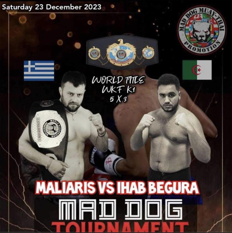 Αναμφίβολα η μάχη που ξεχωρίζει από το επετειακό event «Mad Dog Promotion 30» είναι αυτή ανάμεσα στον Δημήτρη Μάλιαρη του «Giannakopoulos Team» με τον Αλγερινό Ihab Begura με έπαθλο τον παγκόσμιο τίτλο της WKF. Σε αυτήν ο πρωταθλητής του kick box θα δώσει μεγάλη μάχη, προκειμένου η παγκόσμια ζώνη να βαφτεί σε γαλανόλευκο φόντο.