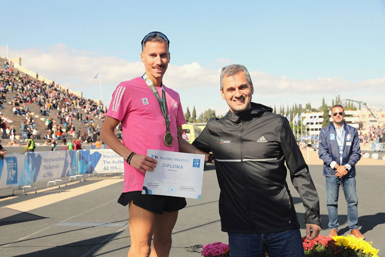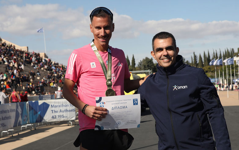 Ο Γιώργος Μενής, τρίτος στο Πανελλήνιο Πρωτάθλημα Μαραθωνίου, και ο Φώτης Ζησιμόπουλος, Chief Sales & Marketing OPAP Stores Officer του ΟΠΑΠ